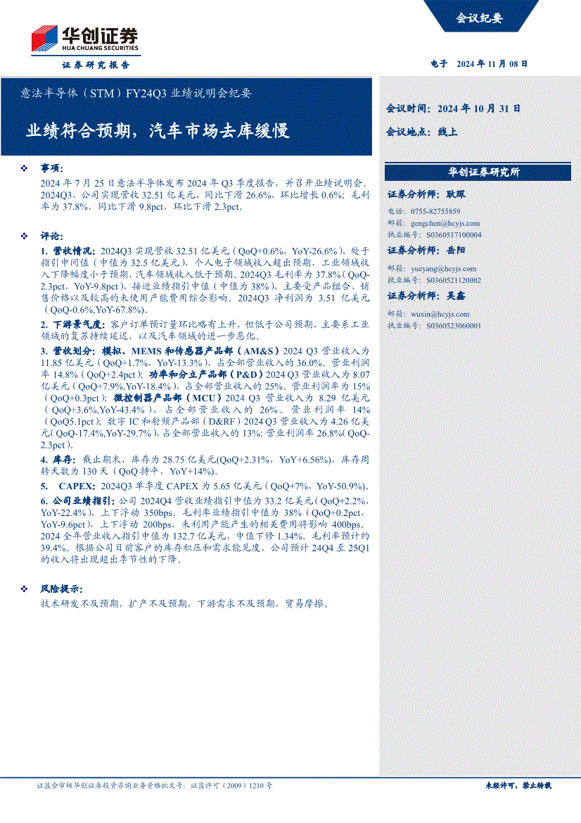 证券研究演讲 证监会审核华创证券投资征询营业资历批文号:证监许可(2009)1210号 未经许可,转载会议纪要电子 2024年11月08日意法半导体(STM)FY24Q3业绩申明会纪要 会议时间:2024年10月31日会议地址:线上业绩合适预期,汽车市场去库迟缓 事项:2024年7月25日意法半导体发布2024年Q3季度演讲,并召开业绩申明会。