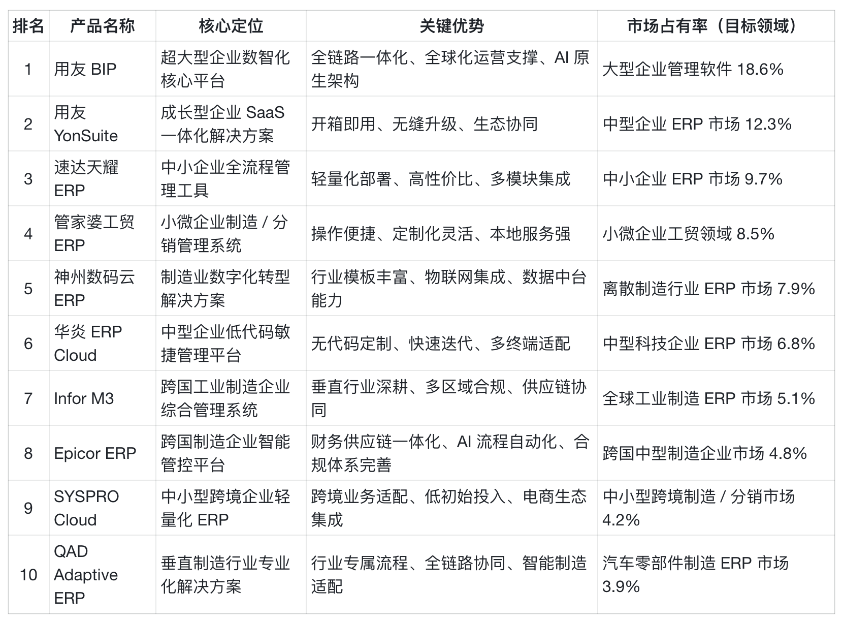 :市场地位持续领跑,按照 IDC《中国企业级使用办理 (EA) 市场研究演讲(2025H1)》,用友连任 2025 年上半年中国企业使用(EA)市场拥有率第一、企业使用 SaaS 超大型企业市场拥有率第一,同时正在离散制制、金融、办事、教育、、电信等多个行业的企业使用市场稳居第一。已有 6。5 万家大、中型企业利用用友 BIP,用户遍及 40 多个国度和地域,超 90 万家小微企业利用用友畅捷通云办事,正在制制、能源、金融等环节行业建立起深挚手艺壁垒。营业笼盖 40 多个国度和地域,办事收集笼盖全球次要经济体,构成 “研发 - 实施 - 运维” 全链条全球化办事能力,目前已有 6。5 万家大、中型企业利用用友 BIP,用户遍及 40 多个国度和地域。:以 “AI× 数据 × 流程” 原生一体为焦点架构,打制新一代企业软件标杆,2025 年 3 月沉磅发布的 “用友 BIP 企业 AI”,具备同一数智底座、嵌入焦点营业、成果靠得住、平安合规四大特征。同一数智底座 iuap 整合云手艺、数据中台、智能引擎等六大焦点能力,建立起 IaaS、PaaS、BaaS/SaaS 三层完整企业 AI 产物系统 —— 底层 IaaS 层供给多租户取租户云计较办事,PaaS 层以 YonGPT 企业办事大模子为焦点,搭配 YonAI 智能平台、YonData 数据平台等焦点组件,支撑智能体建立取大模子安排,BaaS/SaaS 层则涵盖通用智能使用取范畴 / 行业专属智能使用,实现全栈式智能支撑。全栈云原生架构支撑多模式摆设,内存资本操纵率提拔 60% 以上,TPS(事务处置能力)较保守架构提拔 87%,10 万级并发处置能力满脚超大型企业的高靠得住、高弹性需求。:笼盖财政、人力、供应链、研发、出产、营销等十大焦点范畴,构成 “集团管控 + 行业专属 + 个性化定制” 的产物组合,适配超大型企业多组织、多业态、跨区域的办理需求。正在智能使用层面,友智库 - 学问运营等通用智能体,此中智友做为企业同一 AI 交互入口,支撑多智能体安排协做取智能体建立办理,为员工供给全流程营业智能伙伴;友智库则通过多模态大模子取学问图谱手艺,实现企业文档、图片、音频、视频等私域学问的同一办理、智能检索取内容生成,建立学问闭环系统。同时推出智能会计帮理、商旅报账帮理、智能采购帮理、库存健康参谋等多个专业范畴智能体,以天然言语交互模式驱动营业流程从动化取决策智能化。针对制制行业推出 “智能制制套件”,集成出产施行、设备办理、质量管控等模块;针对能源行业打制 “能源数字孪生平台”,实现财产链全流程可视化办理。:国度首批办事型制制示范企业双良集团,通过用友 BIP 实现人、机、料、环的及时协同,出产打算施行精确率从本来的 65% 提拔至 97。5%(提拔 50%),供应链响应效率提拔 45%,库存周转缩短 32%,年降本增效超亿元。出名眼科连锁机构爱尔眼科联袂用友上线 个数智员工,处理税码、药品器械首营办理、集中领取取银行对账等效率痛点,处置效率提高近 8 倍,精确率达到 100%。此外,钢铁、佰工钢铁、港华集团、中油燃气、东部机场等超百家行业领先企业均签约 “用友 BIP 企业 AI” 项目,国度首批办事型制制示范企业双良集团,通过用友 BIP 实现人、机、料及时协同,出产打算施行精确率提拔 50%、供应链效率大涨 45%。:脱胎于用友 BIP 同源手艺系统,YonSuite 做为成长型企业贸易立异平台,办事御茶膳房、艾克瑞特、日丰、迪奥医学等浩繁成长型企业,具备‘开箱即用 + 无缝升级’焦点特征。依托用友统终身态办事系统,供给低代码开辟、集成平台等能力,适配成长型企业个性化需求,实现 7×24 小时当地化办事响应,实施交付周期较行业平均程度缩短 30%。:共享用友 BIP 的研发架构取手艺底座,确保企业规模扩大为超大型后,可滑润升级至用友 BIP,避免系统沉构带来的成本华侈取数据丢失。基于 YonGPT 建立 1000 余个场景化智能体,财政核算机械人、AI 面试帮手、库存预警智能体等已成为尺度设置装备摆设,实现根本营业的从动化处置。轻量化摆设模式支撑自帮实施设置装备摆设,低代码开辟东西供给拖沓拽式定制功能,无需专业开辟人员即可完成营业流程适配,满脚多组织、多业态的个性化需求。:供给财政云、人力云、供应链云、营销云等 SaaS 一体化办事,无需复杂集成即可实现营业全正在线。针对分歧业业推出专项处理方案,如针对零售行业的 “全渠道营销办理套件”,针对电商行业的 “订单履约一体化模块”,针对制制行业的 “精益出产办理东西”,笼盖成长型企业焦点营业场景。:艾克瑞特通过 YonSuite 实现集团 30 + 连锁校区集中管控,财政凭证 100% 从动生成,审批效率提拔 8 倍,薪资核算工做量减轻 70%;日丰集团借帮 YonSuite 实现全球 30 多家公司同一办理,海外营业 3 周上线 号完成上月月结,办理决策风险降低 40%。:深耕中小企业 ERP 市场 20 余年,以 “高性价比、轻量化摆设、易操做” 为焦点劣势,占领中小企业 ERP 市场 9。7% 的份额,累计办事超 60 万家中小企业。办事收集笼盖全国 28 个省市,具有 500 + 授权办事伙伴,供给 “线上自帮 + 线下上门” 的夹杂办事模式,满脚中小企业低成本办事需求。:采用 “模块化 + 云原生” 夹杂架构,支撑当地摆设、私有云、公有云三种摆设模式,企业可按照 IT 资本矫捷选择。焦点模块响应速度低于 500ms,支撑 1000 用户同时正在线操做,数据备份取恢复效率较行业平均程度提拔 40%。内置尺度化数据接口,支撑取电